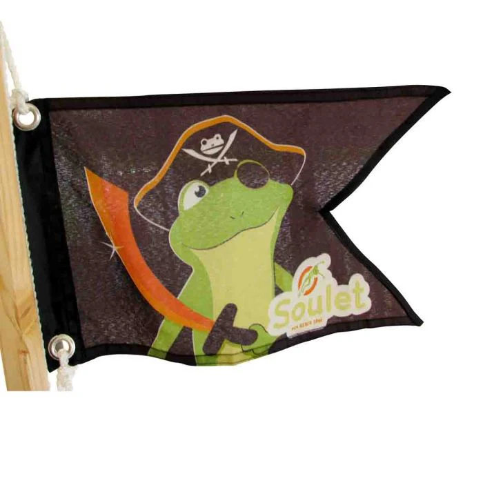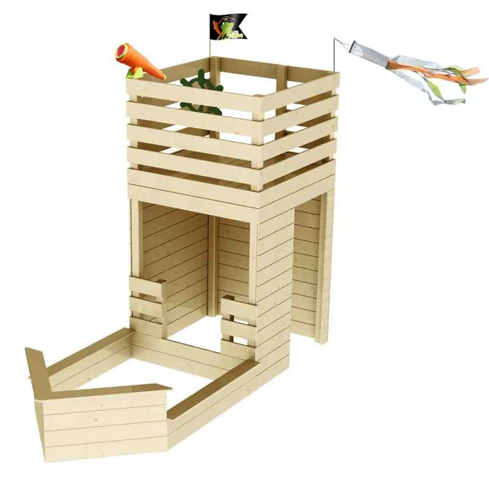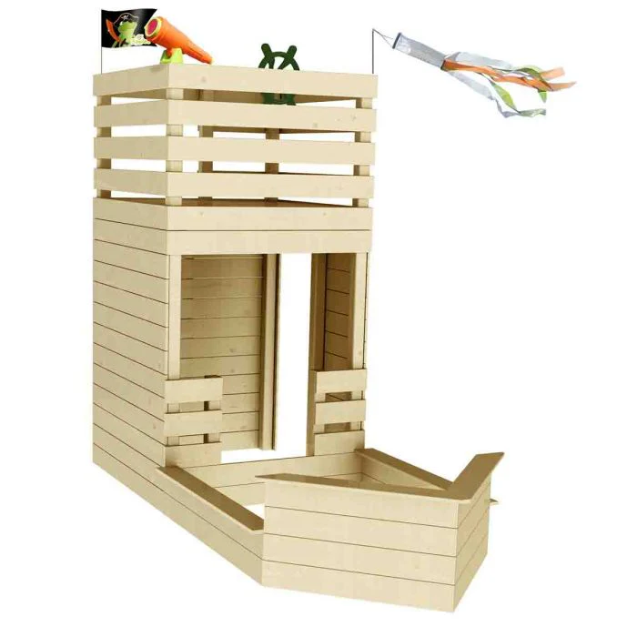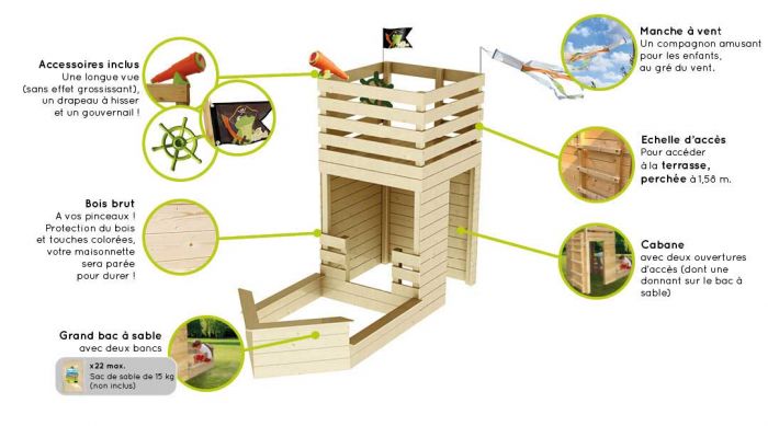 Son étage supérieur constitue un superbe poste d’observation de bateau pirate avec sa longue vue, son gouvernail et son pavillon pirate, où ils monteront pour inventer des histoires, seul ou à plusieurs.